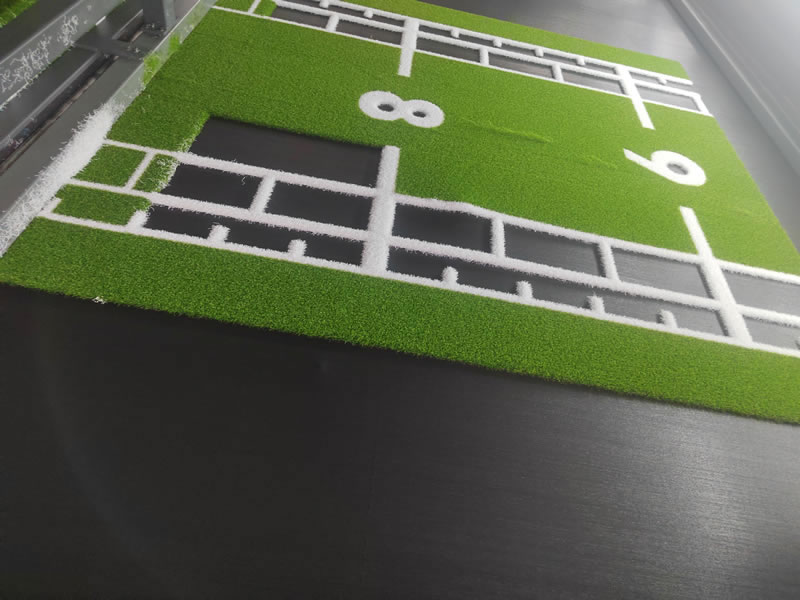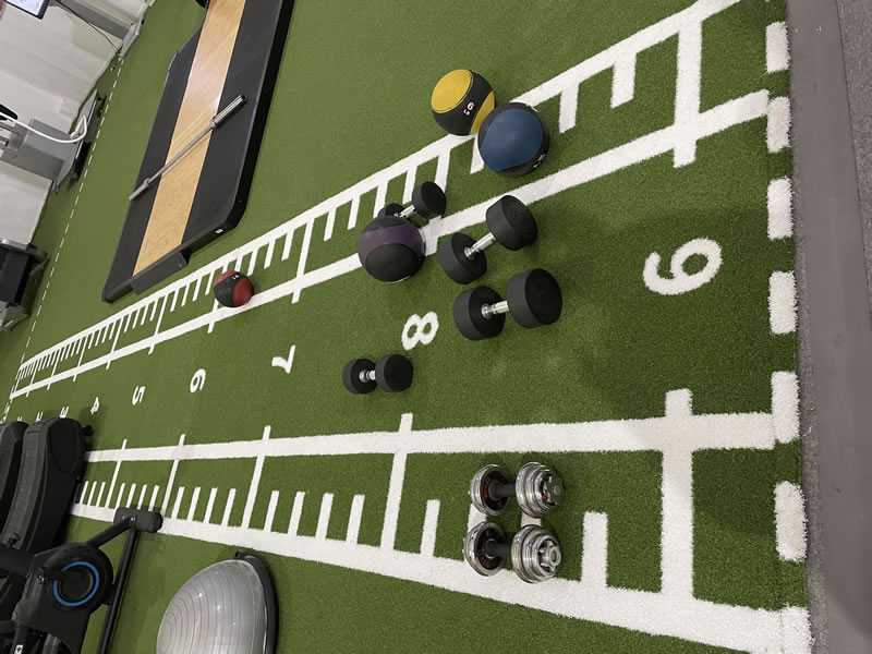 Si está buscando una forma concisa y clara de distinguir las áreas deportivas en lugares de fitness o mostrar el logotipo de la marca de su empresa, las versátiles opciones de diseño de nuestro césped artificial con patrones también permiten varios gráficos deportivos o elementos de marca, lo que hace que su espacio de fitness sea funcional y visualmente atractivo.
